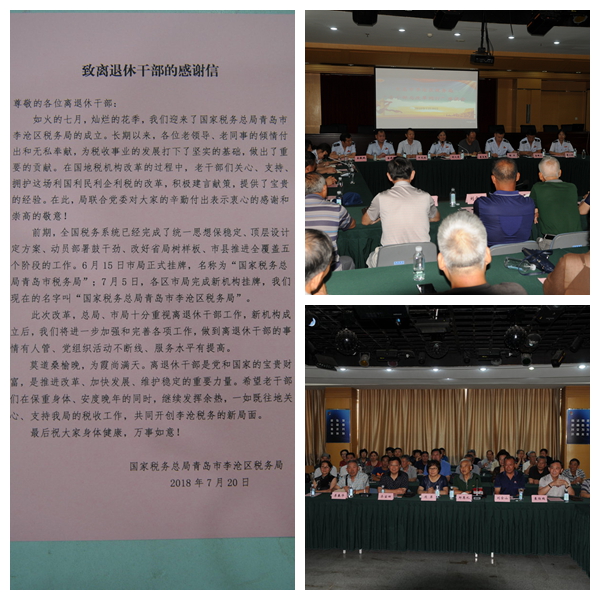 同时,为老干部们送上“三个一”,送上一封感谢信,同照一张全家福,共进一顿“团圆饭”,还与老干部们一同分享了挂牌仪式的精彩瞬间,在如火的七月,共同收获幸福的喜悦,让老干部更舒心、更放心、对机构改革更关心,对税收工作更有信心。